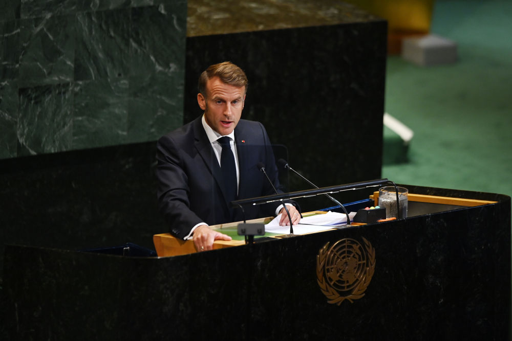 9月22日,在位于纽约的联合国总部,法国总统马克龙在和平解决巴勒斯坦问题和落实“两国方案”高级别国际会议上讲话。新华社记者李睿摄